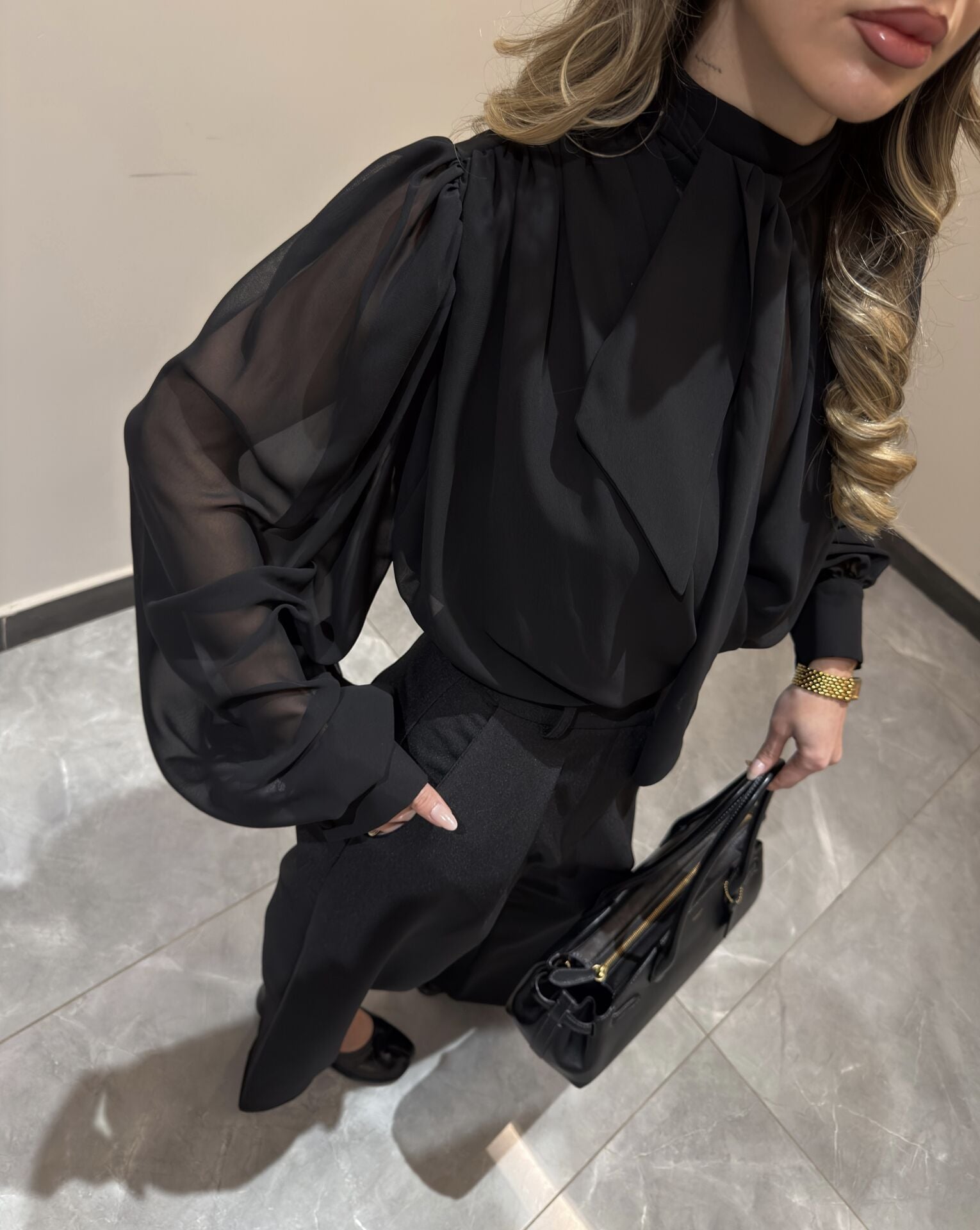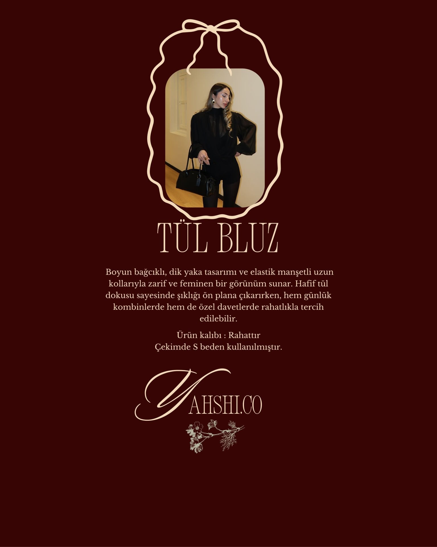 Boyun bağcıklı, dik yaka tasarımı ve elastik manşetli uzun kollarıyla zarif ve feminen bir görünüm sunar. Hafif tül dokusu sayesinde şıklığı ön plana çıkarırken, hem günlük kombinlerde hem de özel davetlerde rahatlıkla tercih edilebilir.